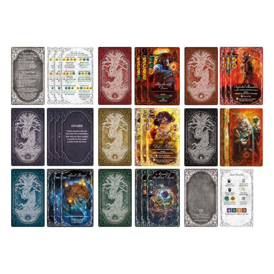 Includes 6 Curse cards, 34 Item cards, 4 Special Item cards, 18 Minor Omen cards, 16 Major Omen cards, 5 Character cards, 6 Journey cards, 5 Reference cards, and Game Rules.