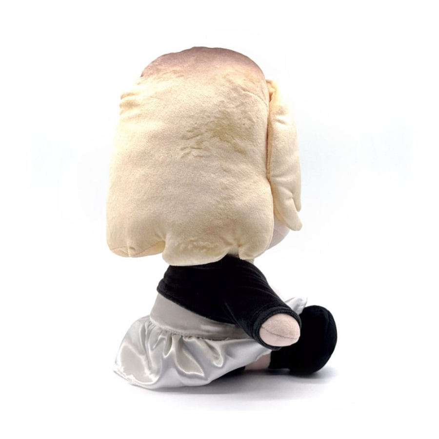 Calling all short kings, the woman, or doll of your dreams has arrived this Halloween season with an all-new look! Tiffany Valentine is making her debut as a Youtooz plush and she looks killer! Sitting at 9 inches tall with her feet kicked forward, Tiff is dressed in black boots under a white wedding gown along with an edgy black jacket and a yellow chain necklace that says "Tiff" around her neck. With platinum blonde hair that has dark roots falling down to her shoulders and framing her face, she has an evil smirk as a dark smokey eye is paired with a dark lip. This plush is packed to the seams with 100% PP cotton and is made of normal and sublimated minky materials, felt, and satin, perfect for cuddling or serving killer looks with!