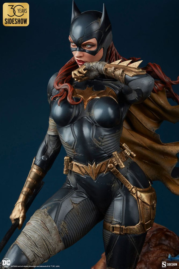 The polystone Batgirl Premium Format Figure measures 21.73" tall by 13.43" wide by 13.9" deep. Inspired by the characters as they appear in DC Comics, this collectible is fully sculpted to capture everything from her costume details down to the varied textures of Clayface's body. Cloth-like bandages wrap Batgirl's arms and legs, while her tactical Batsuit is accented with armored gold elements like gauntlets, boots, and a utility belt. Batgirl's outfit is weathered to reflect the perils of crimefighting in Gotham City, and a tattered cape flutters off her shoulder. Below her, Clayface alternates between melting, muddy ooze and dried, cracked dirt where the Batarangs have zapped him.