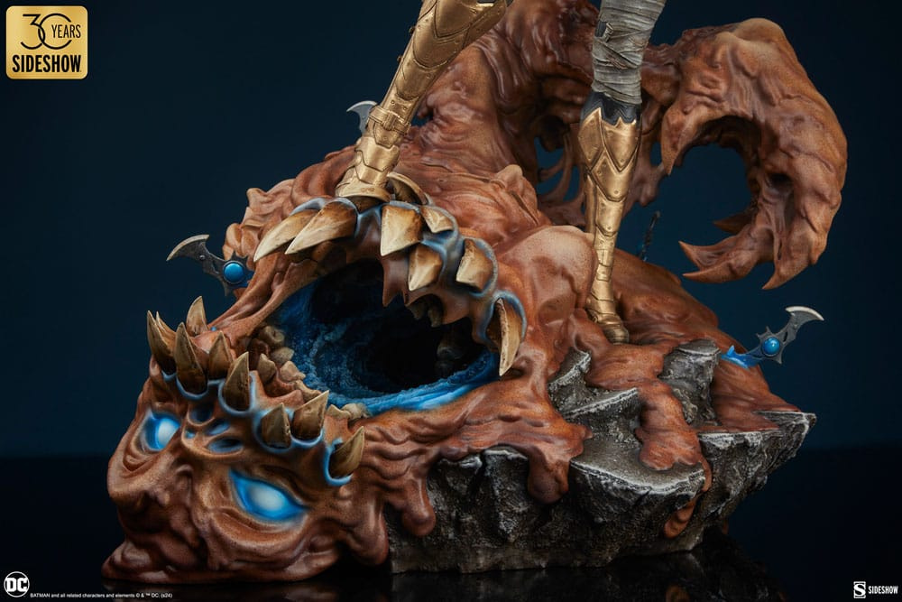 The polystone Batgirl Premium Format Figure measures 21.73" tall by 13.43" wide by 13.9" deep. Inspired by the characters as they appear in DC Comics, this collectible is fully sculpted to capture everything from her costume details down to the varied textures of Clayface's body. Cloth-like bandages wrap Batgirl's arms and legs, while her tactical Batsuit is accented with armored gold elements like gauntlets, boots, and a utility belt. Batgirl's outfit is weathered to reflect the perils of crimefighting in Gotham City, and a tattered cape flutters off her shoulder. Below her, Clayface alternates between melting, muddy ooze and dried, cracked dirt where the Batarangs have zapped him.