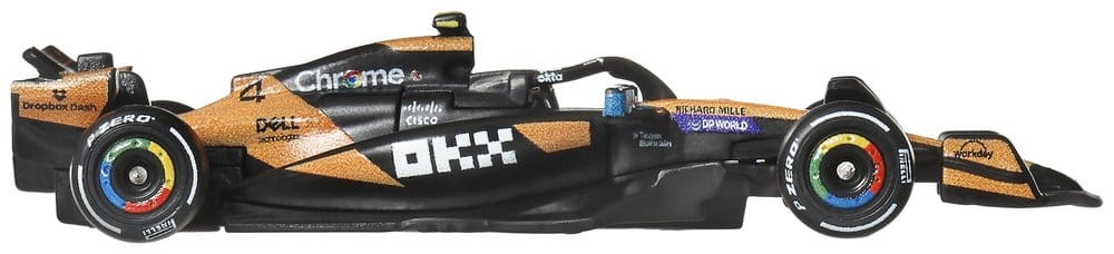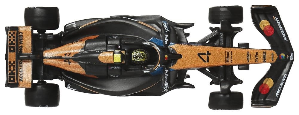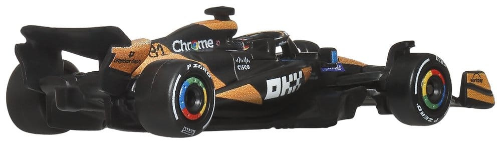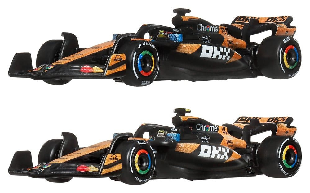 With this Hot Wheels Premium McLaren F1 Team 2-Pack, any Hot Wheels collection shifts into turbo gear. The set includes 1:64 scale die-cast race cars inspired by the models driven by Oscar Piastri and Lando Norris. Each car features authentic liveries with realistic front wings and side pods, as well as detailed driver helmets. The metal body and chassis, along with Real-Riders tires, highlight the high-quality craftsmanship of the cars. With special packaging and an individual display base, both drivers score points. Color and design may vary.