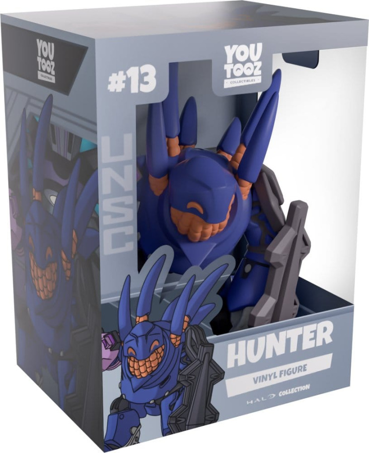 Crashing through the walls of Youtooz for their explosive debut! Kneeling at 5.1 inches tall and thrusting a purple assault cannon with green cartridges forward with their right arm, they slam a thick grey metal shield into the ground in front of their left knee as protection from oncoming fire. With a mass of orange Lekgolo swarming inside the grey and blue armor to make up their thick body, a small angled helmet covers where their head should be as six long spikes extend from their back. The exterior of their packaging looks into the purple and grey hallways of a ship, while the light grey interior is covered in angled patterns which extend onto the protective sleeve with the UNSC logo as their figure can be seen through the large clear window at the packaging's front. This collectible ships in a matte, embossed, protective outer sleeve and a custom-sized plastic protector for maximum protection during shipping.