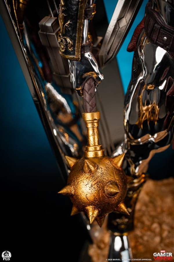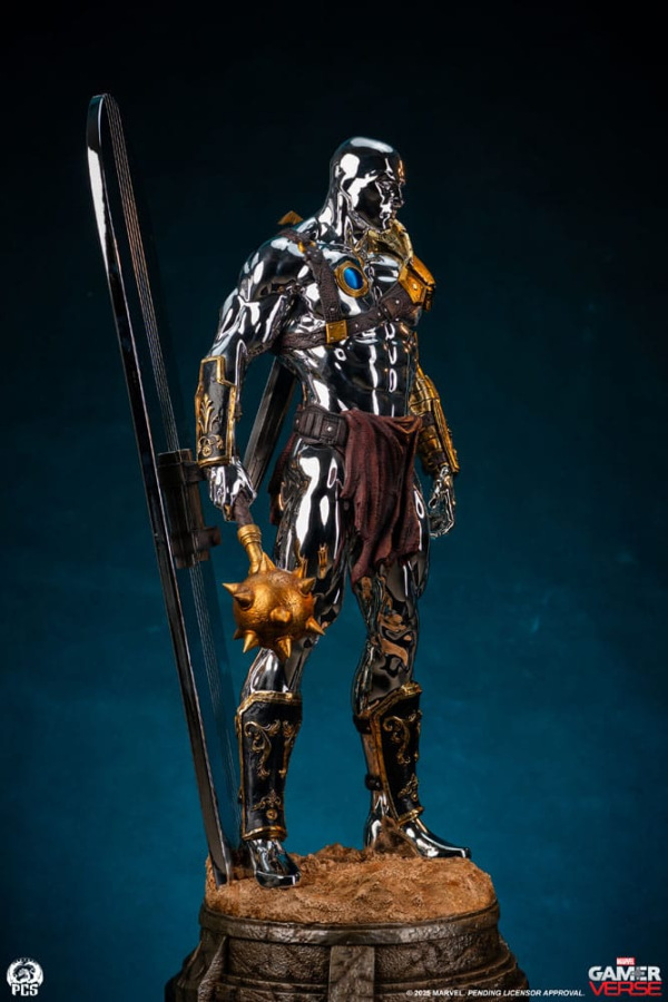 The Silver Surfer himself is covered in a dazzling, reflective chrome finish from head to toe. The finish appears even brighter when set against the battle worn armor and weapons he is adorned with. In his right hand he wields a spiked mace while behind him his iconic surfboard, fashioned into a makeshift shield, juts out from the base which has been sculpted with a realistic sand-like texture to recreate the feel of the harsh terrain.