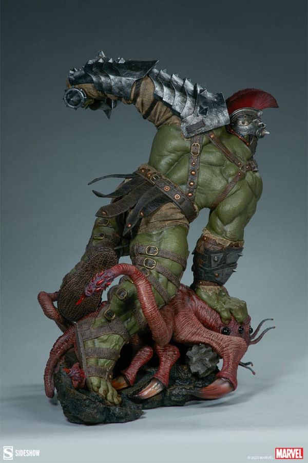 Inspired by the iconic Planet Hulk storyline, the Gladiator Hulk Maquette measures a monstrous 26" tall as the jade giant smashes a helpless alien fighter into the dirt of the Sakaarian coliseum. Barbed tentacles and claws are no match for the giant gladiator as he pummels his extraterrestrial enemy into a broken stone pillar on top of the battleground base. His alien enemy features a detailed design, with red textured skin and a multitude of glistening eyes.