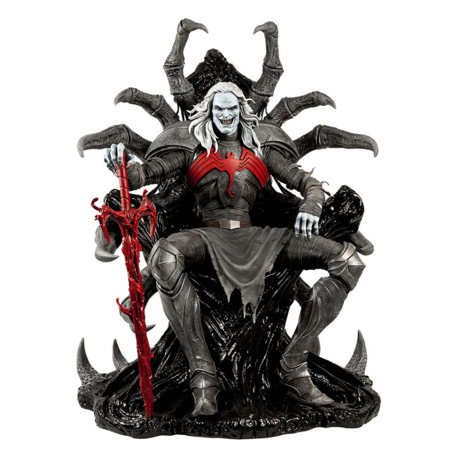 This fully sculpted statue measures an impressive 33" tall and depicts the interstellar deity seated confidently atop his throne with his sinewy red symbiote sword at his side. Knull is outfitted in a set of dark armor emblazoned with a vibrant red spider on the chestplate. His arms and legs are wrapped in tattered fabric straps, sculpted here with amazing detail. His throne has the smooth, glasslike texture of the symbiote in liquid form. Jutting out from his monstrous seat are massive, ancient looking spider legs extending outward and almost embracing the King in Black.