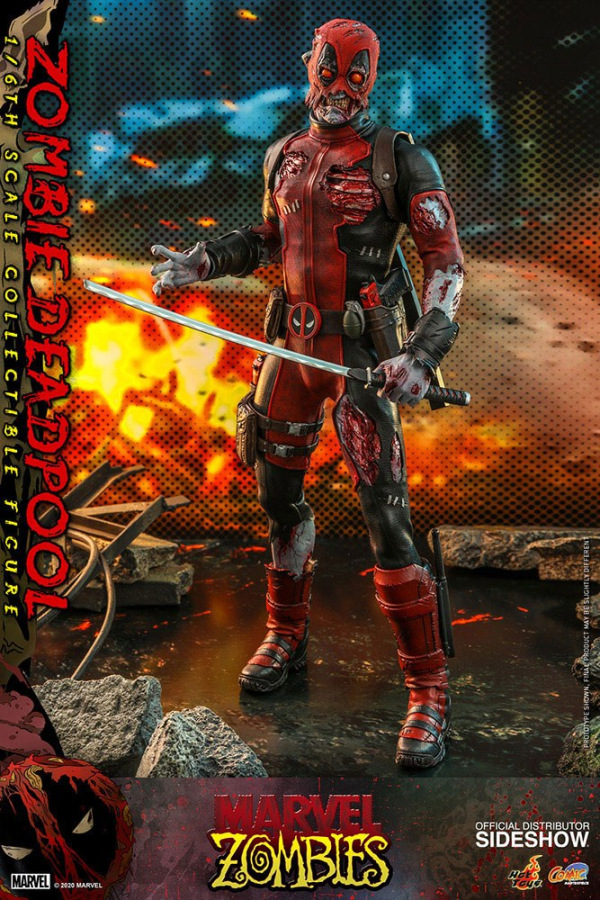 Sideshow and Hot Toys present the very first collectible from Marvel comic series Zombie Deadpool Sixth Scale Collectible Figure. A visually stunning piece showcasing ripped and torn muscle, tattered costume remnants that depict the Merc with a Mouth from Marvel Zombies comic pages.