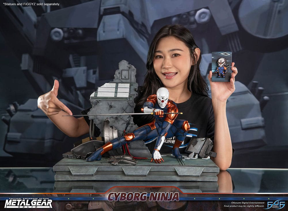The statue is inspired by the intense boss battle where Cyborg Ninja and Solid Snake face off against Liquid Snake, who is piloting the Metal Gear REX. It depicts Cyborg Ninja in a dynamic, ninja-like pose, wielding his high-requency blade in his right hand. The statue faithfully captures his appearance, showcasing the blue, brown, and white Cyborg Ninja Exoskeleton, with the distinctive red lamp in the center of his face mask flanked by eyeholes on both sides. The base design meticulously recreates the scene of the boss battle set in the underground base of Shadow Moses.