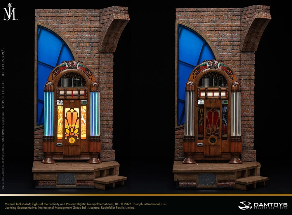 The product features the outfit Michael Jackson wore in his "Smooth Criminal" short film. With flawless reproduction detailing. Every element, from the texture of the costume's patterns and the vintage details of the diorama base and jukebox that recreates the set from the short film.