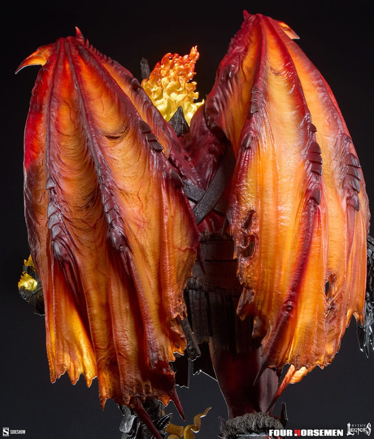 The Arethyr: War Statue measures 20.6" tall x 23.44" wide x 13.3" deep, capturing this hellion's hunger for battle. The warmonger brandishes the flaming Aetherblade sword as he storms over a field of broken armaments and fallen fighters. His devilish form exudes brute strength, with leathery wings poised to unfurl. Arethyr is protected by wicked black armor forged in the ruthless fires of conflict, with monstrous horned pauldrons on either shoulder and a matching belt ornament across his waist. His grimacing portrait is guarded by a cage-like mask, crowned with a blazing tongue of fire.