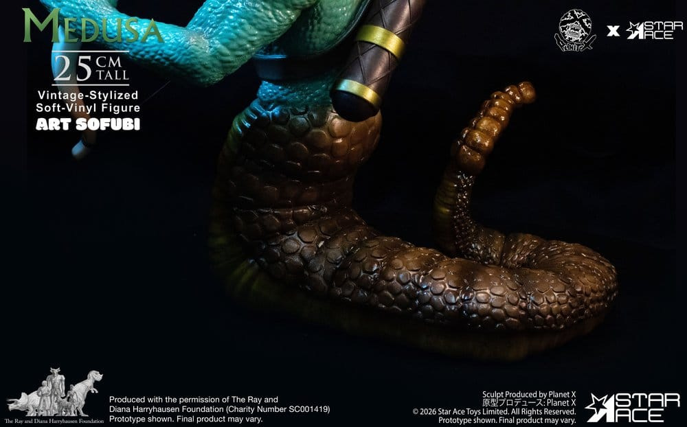 The hunt begins! Star Ace proudly unveils the next stunning release in our vintage-style soft-vinyl figure series-the terrifying Medusa, rising from the mythic depths of the 1981 classic Clash of the Titans. Officially licensed as part of the Ray Harryhausen Collection, this serpent-haired Gorgon slithers onto your shelf in bold retro sofubi style.