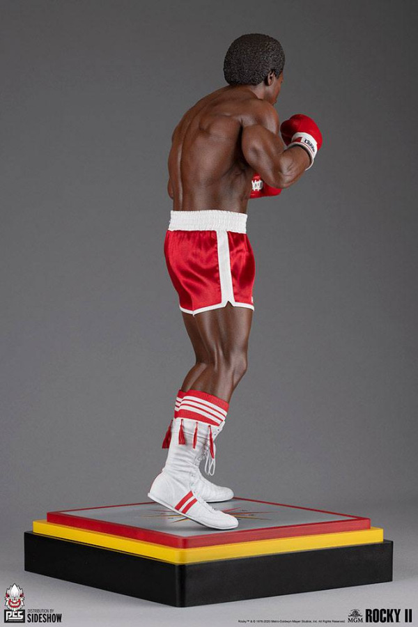 "I'm gonna drop him like a bad habit." Sideshow and Premium Collectibles Studio present the Apollo Creed 1:3 Scale Statue - Rocky II Edition, stepping into the ring with your Rocky movie collection. Apollo Creed takes to the mat in this extremely detailed and lifelike 1:3 scale collectible statue based on the iconic Rocky film series, expertly sculpted in the likeness of actor Carl Weathers. The heavyweight champion boxer measures 23" tall, standing on a 13" wide black, yellow, red, and gray boxing ring canvas base detailed with a star in the center. Light on his feet and boasting a muscled physique, Apollo Creed keeps his fists raised in anticipation of a rematch versus series protagonist Rocky Balboa. The Apollo Creed 1:3 Scale Statue - Rocky II Edition features a mixed media costume with custom tailored fabric elements to give collectors multiple display options on their shelf. His fabric red and white shorts feature an elastic-style waistband and his name on the thighs, and the collectible additionally includes a removable white and red entrance robe emblazoned with his World Heavyweight Champion title on the back. A display rack is included for when the robe is not being worn. The figure has sculpted red boxing gloves as well as sculpted socks and boots in a matching red and white color pattern. Fans can recreate this heavy hitter's signature cinematic appearance on your shelf by pairing him with the Rocky II 1:3 Scale Statue by Premium Collectibles Studio, sold separately. Make him the champion of your collection - bring home the Apollo Creed 1:3 Scale Statue - Rocky II Edition by Premium Collectibles Studio today! Product Size: 66 x 33 x 33 cm