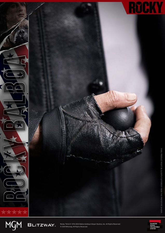 With meticulous attention to detail, we crafted the leather jacket using genuine leather fabric, capturing every aspect of Rocky Balboa's rugged and masculine persona, right down to the scars above his eyebrows. Additionally, the statue features rooted hair, enhancing its vivid and lifelike appearance.