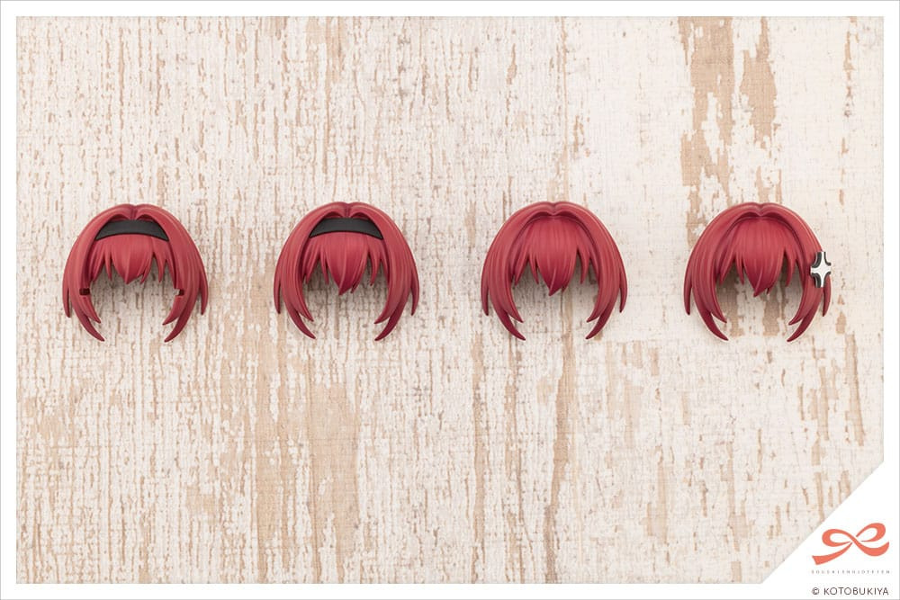 Array of Accessories: As Emma aspires to be a god-like artist, the kit also includes computer tablet and drawing tablet accessories for drawing poses. The back of the computer tablet features a certain special emblem. The smartphone also comes in two versions, standard mode and gaming mode, with the beloved HEXA GEAR logo etched into the back. The St. Iris Gakuen Girls' High School bag features a removable school emblem covering a 0.3 cm hole that can be used with flying bases. Five hair accessory parts for the various bangs are also included.