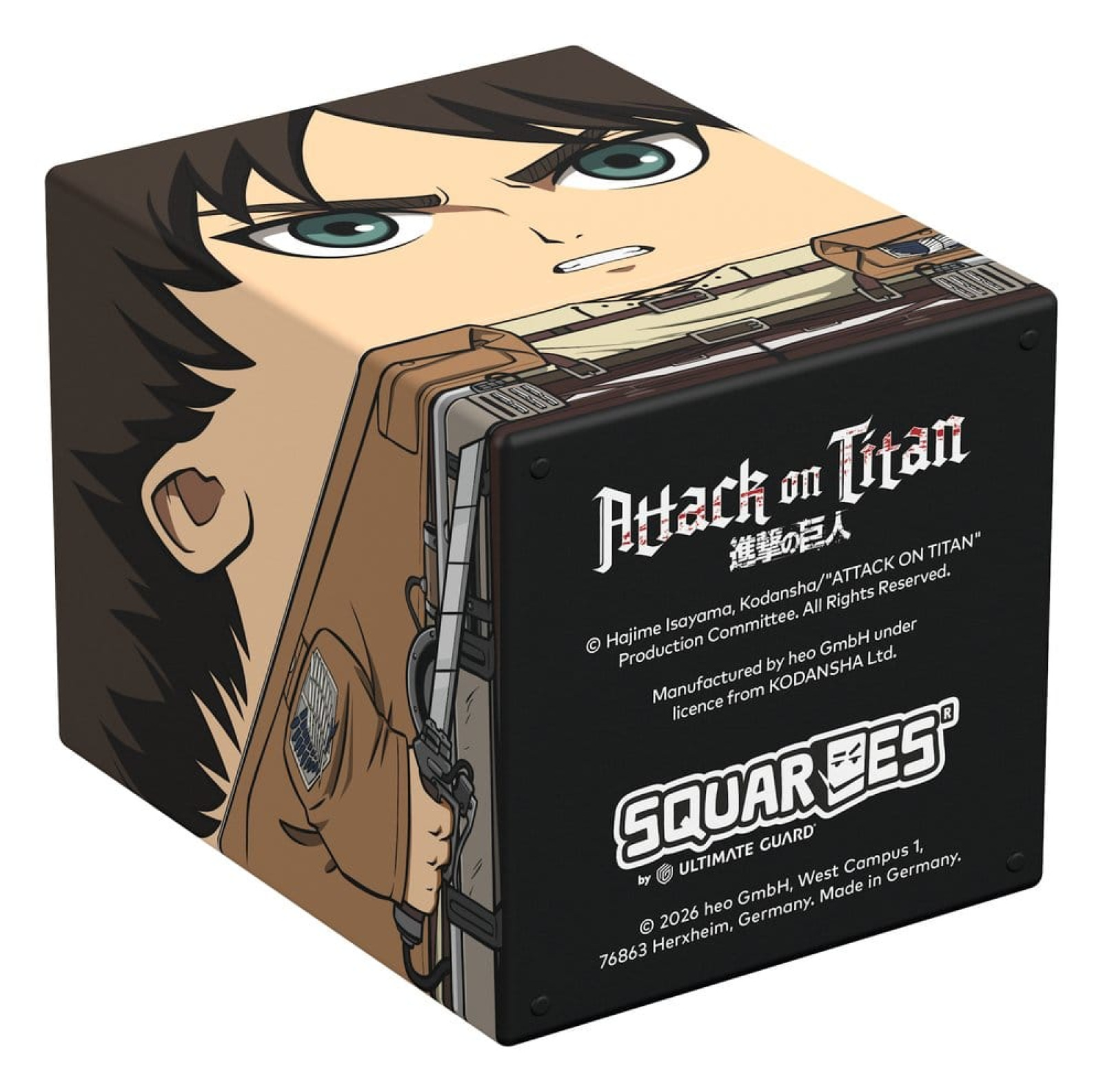 Collectible box for storing TCG decks, tabletop gaming accessories, and/or collectibles. The Eren Jäger Squaroe from the Attack on Titan edition holds up to 100 cards in double protective sleeves if used as a deck box. Squaroes are made from 78% renewable resources and fit perfectly into the separately available Collectors Case.