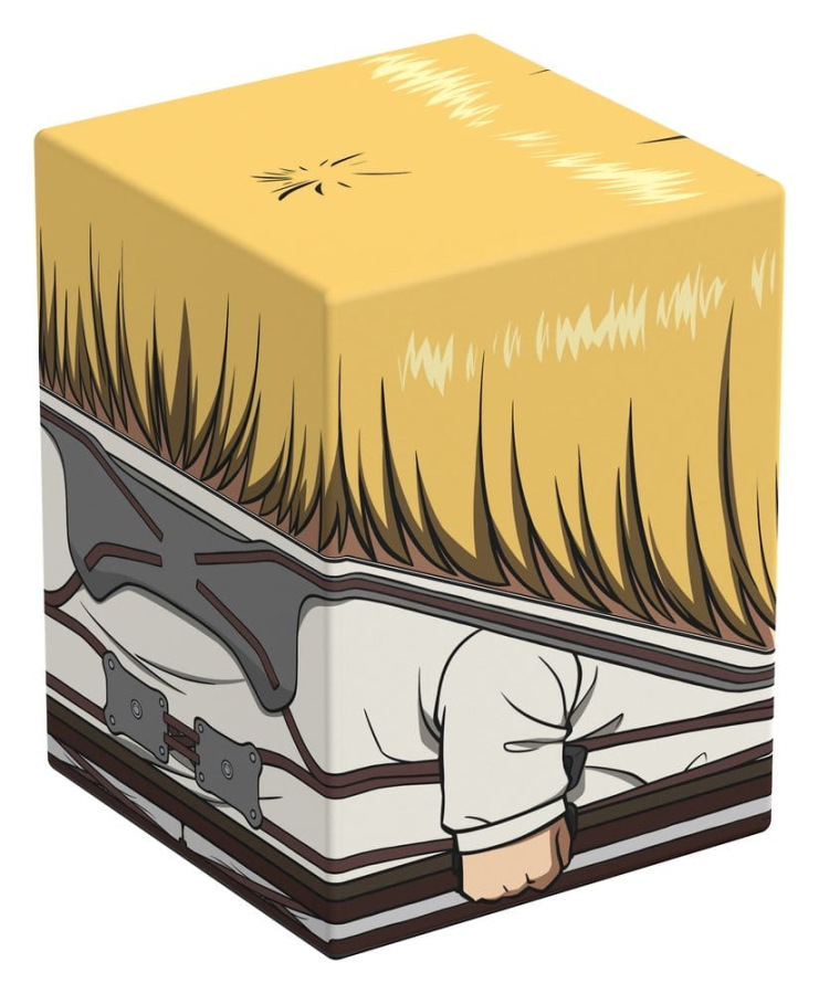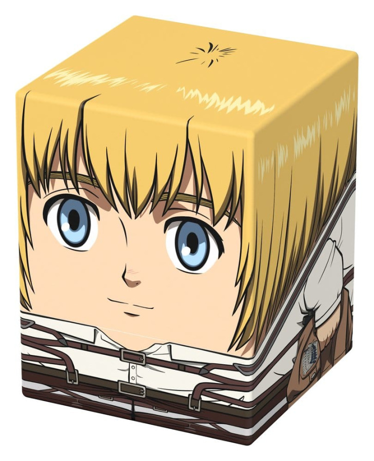 Collectible box for storing TCG decks, tabletop gaming accessories, and/or collectibles. The Armin Arlert Squaroe from the Attack on Titan edition holds up to 100 cards in double protective sleeves if used as a deck box. Squaroes are made from 78% renewable resources and fit perfectly into the separately available Collectors Case.