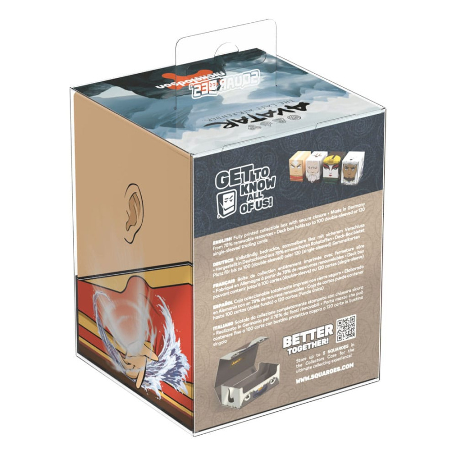 Collectible box for storing TCG decks, tabletop gaming accessories, and/or collectibles. The Avatar Aang Squaroe from the Avatar: The Last Airbender edition holds up to 100 cards in double protective sleeves if used as a deck box. Squaroes are made from 78% renewable recources and fit perfectly into the separately available Collectors Case.