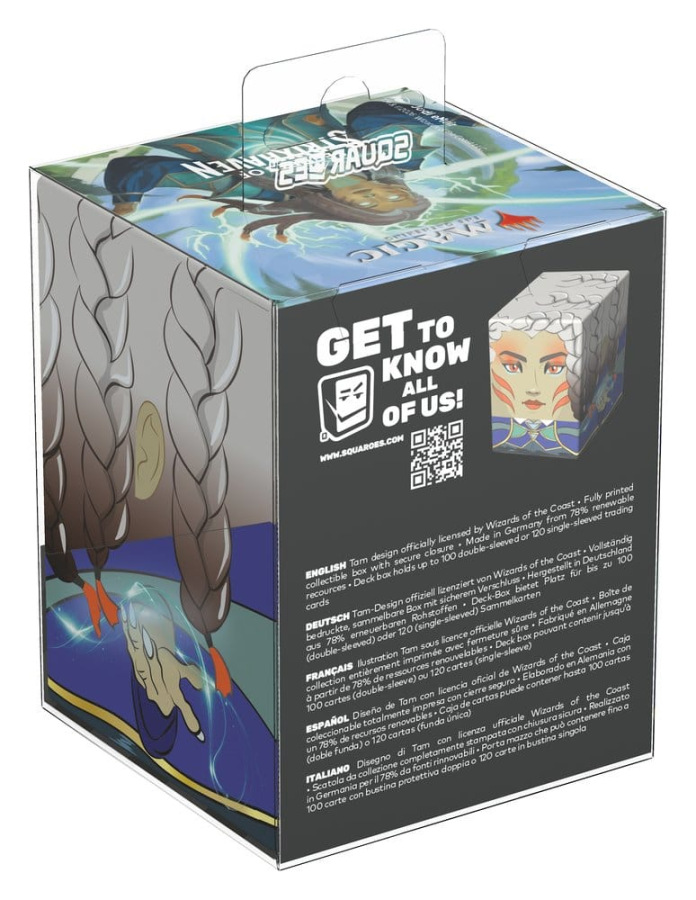 Collectible box for storing TCG decks, tabletop gaming accessories, and/or collectibles. Holds up to 100 cards in double protective sleeves if used as a deck box. Squaroes are made from 78% renewable recources.