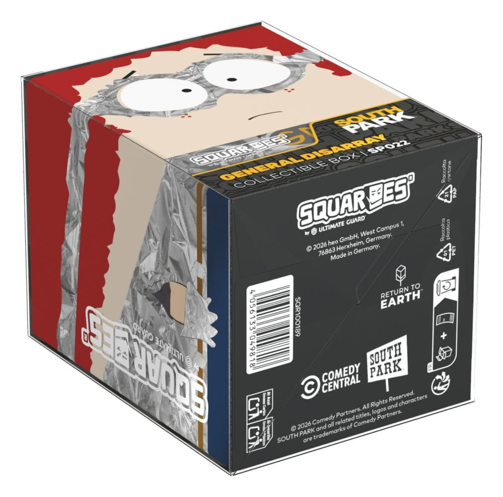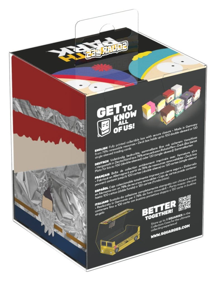 Collectible box for storing TCG decks, tabletop gaming accessories, and/or collectibles. The General Disarray Squaroe from the South Park™ edition holds up to 100 cards in double protective sleeves if used as a deck box. Squaroes are made from 78% renewable resources and fit perfectly into the separately available Collectors Case.