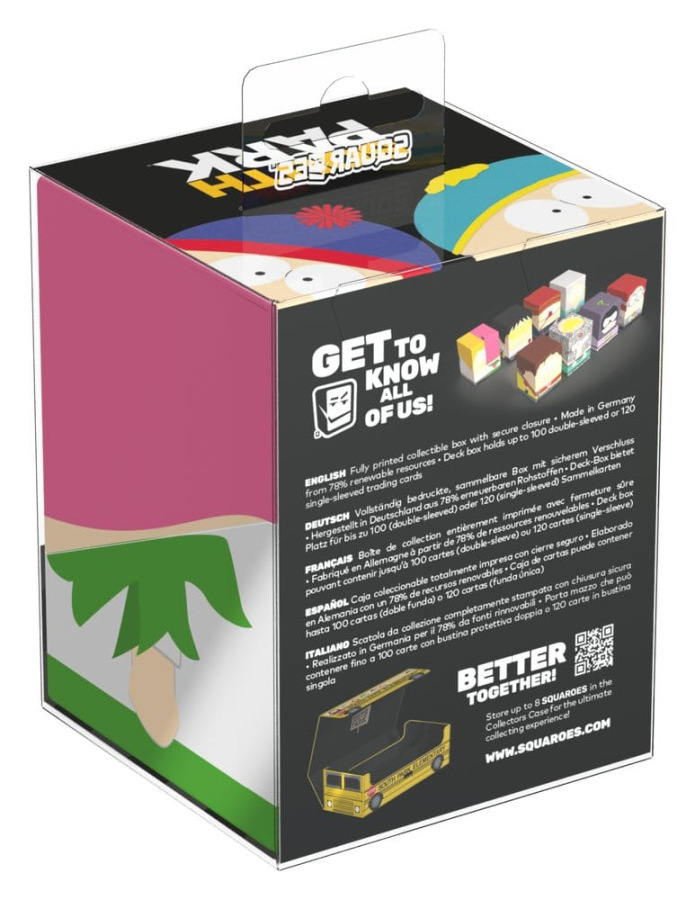 Collectible box for storing TCG decks, tabletop gaming accessories, and/or collectibles. The Mintberry Crunch Squaroe from the South Park™ edition holds up to 100 cards in double protective sleeves if used as a deck box. Squaroes are made from 78% renewable resources and fit perfectly into the separately available Collectors Case.