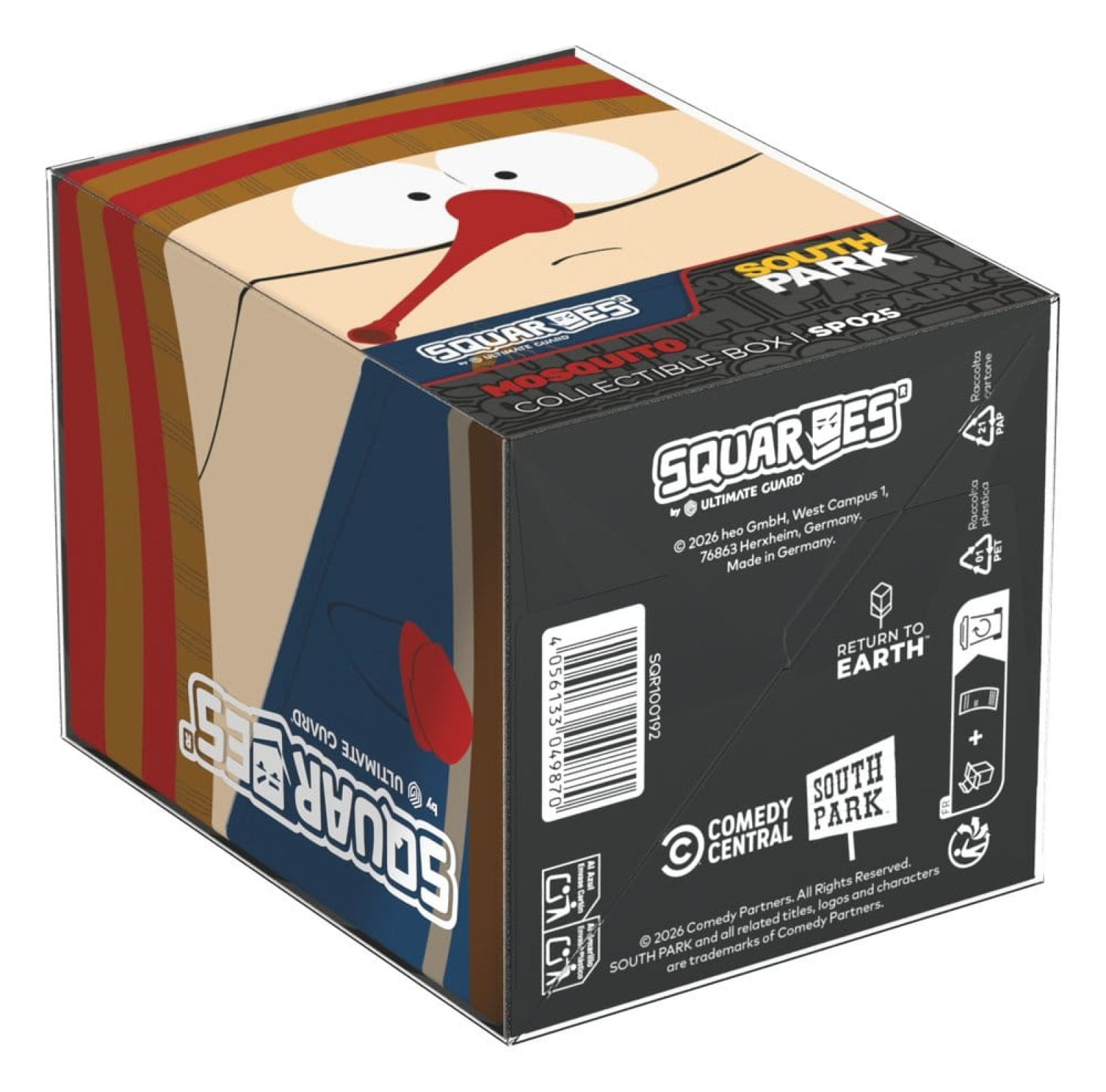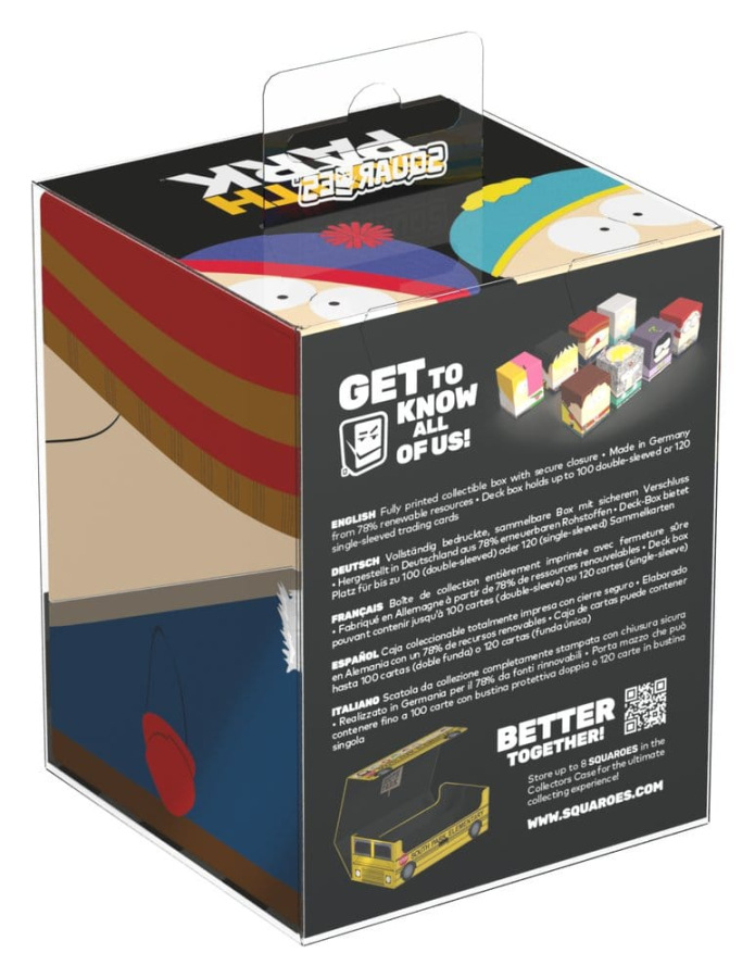 Collectible box for storing TCG decks, tabletop gaming accessories, and/or collectibles. The Mosquito Squaroe from the South Park™ edition holds up to 100 cards in double protective sleeves if used as a deck box. Squaroes are made from 78% renewable resources and fit perfectly into the separately available Collectors Case.