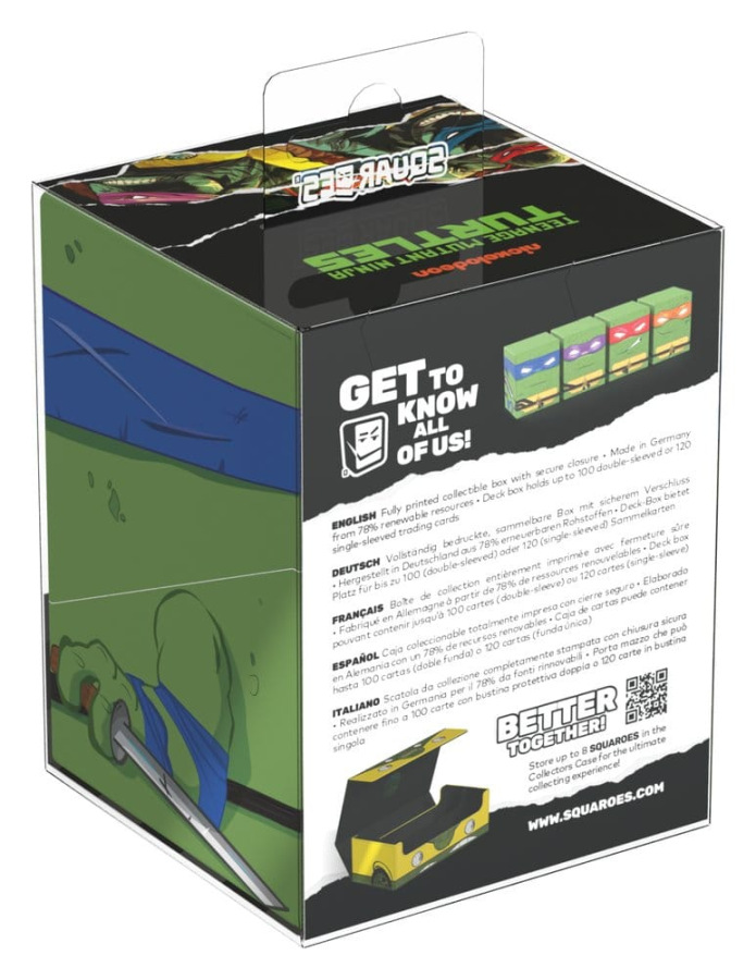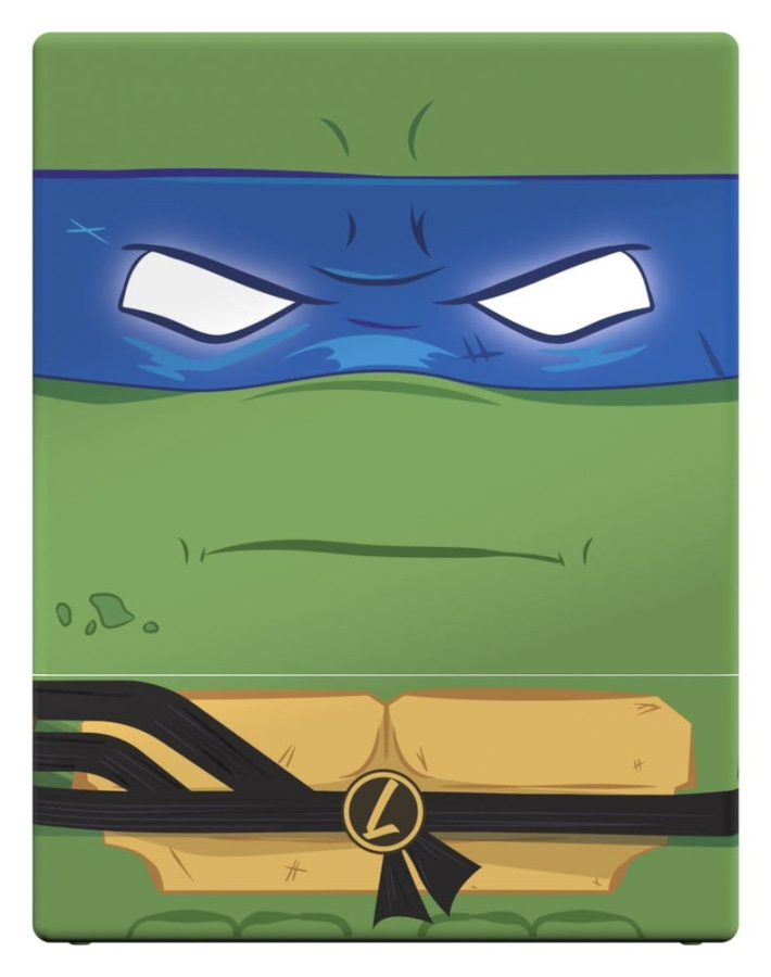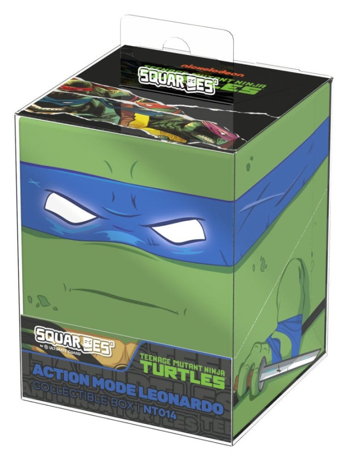 Collectible box for storing TCG decks, tabletop gaming accessories, and/or collectibles. The Action Mode Leonardo Squaroe from the Teenage Mutant Ninja Turtles™ edition holds up to 100 cards in double protective sleeves if used as a deck box. Squaroes are made from 78% renewable recources and fit perfectly into the separately available Collectors Case.