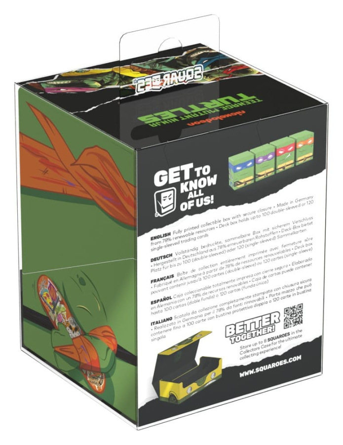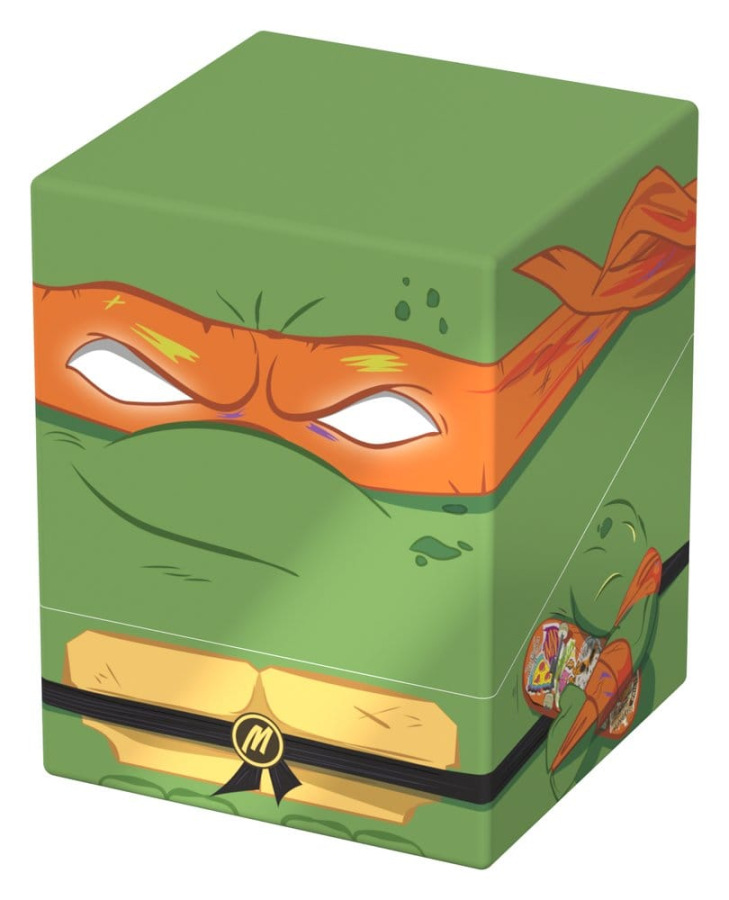 Collectible box for storing TCG decks, tabletop gaming accessories, and/or collectibles. The Action Mode Michelangelo Squaroe from the Teenage Mutant Ninja Turtles™ edition holds up to 100 cards in double protective sleeves if used as a deck box. Squaroes are made from 78% renewable recources and fit perfectly into the separately available Collectors Case.