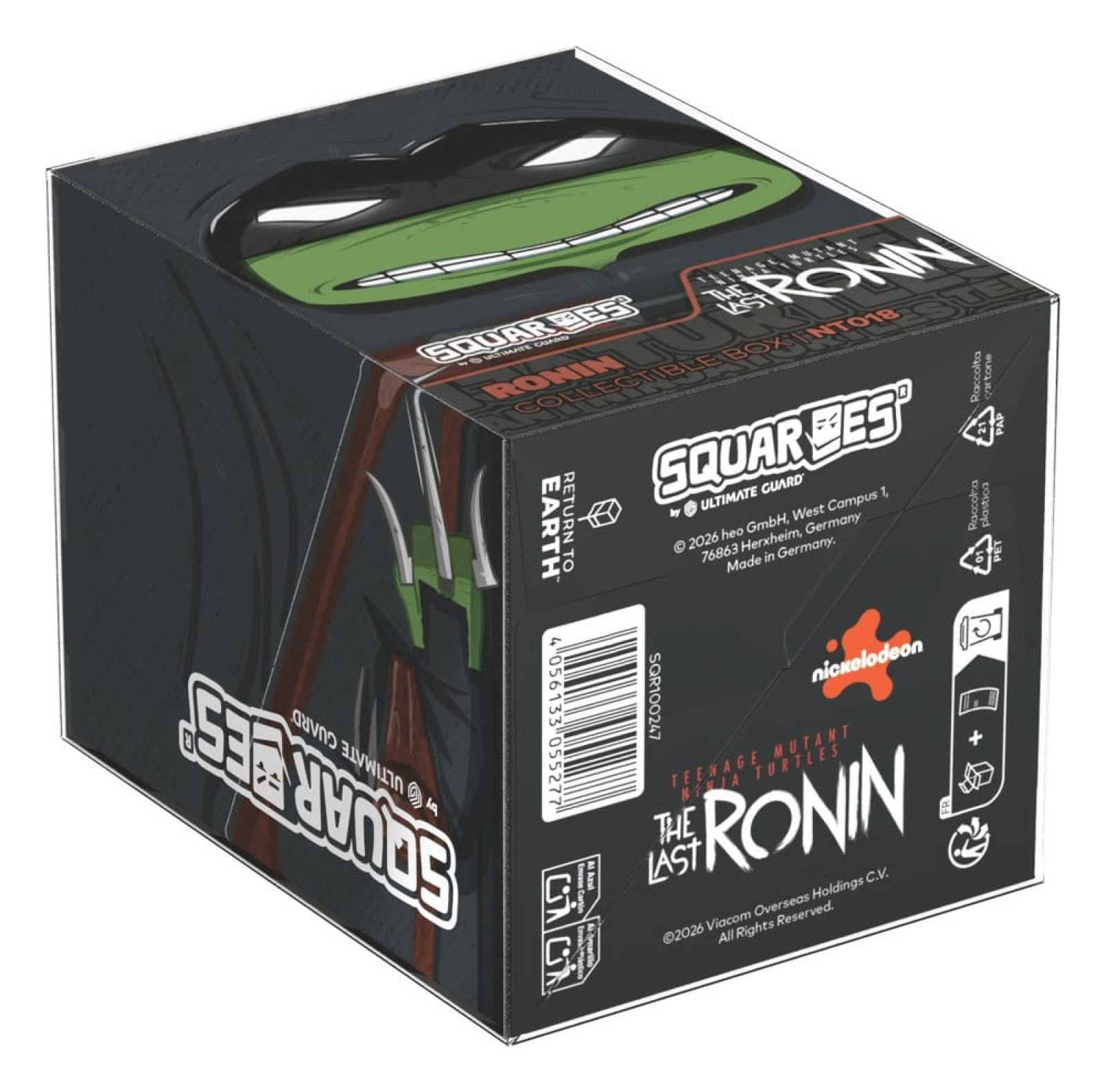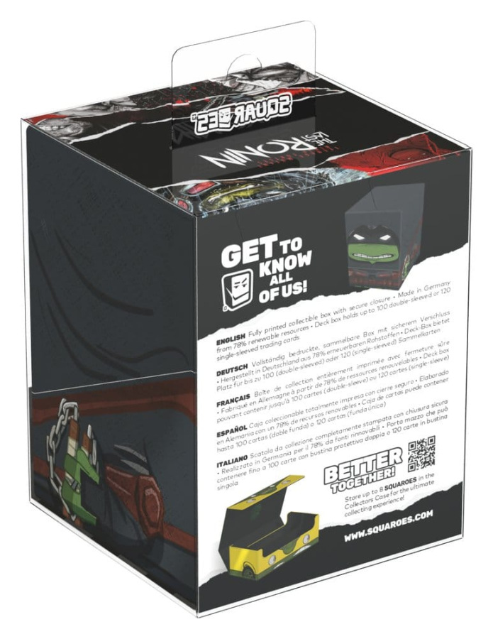 Collectible box for storing TCG decks, tabletop gaming accessories, and/or collectibles. The Ronin Squaroe from the Teenage Mutant Ninja Turtles™ edition holds up to 100 cards in double protective sleeves if used as a deck box. Squaroes are made from 78% renewable recources and fit perfectly into the separately available Collectors Case.