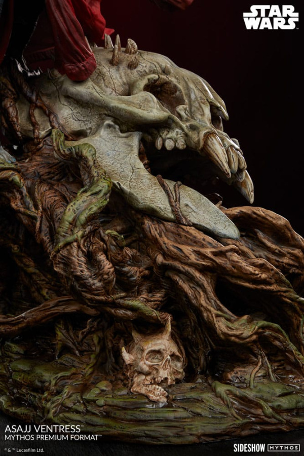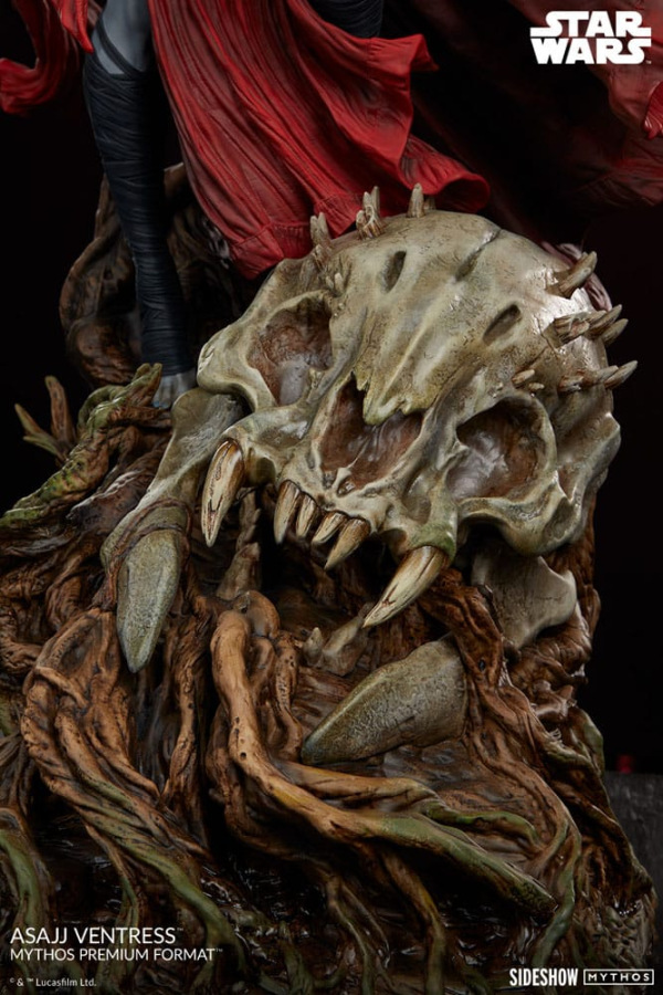 The Asajj Ventress Mythos Premium Format™ Figure measures 27" tall, 17" wide, and 17" deep as this menacing Nightsister stands poised on a snarling Ssurian skull. Its skeletal remains are snared in her home planet's native flora as well as the gnarled growths of a Dathomirian swamp. The Sith assassin herself is swathed in an intricately flowing red and black outfit while she wields dual red Lightsabers - a sign of the grueling battle to come as she chases glory in the galaxy.
