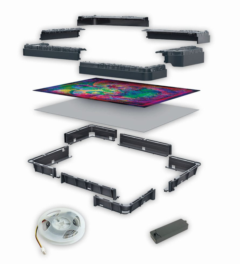 Put the puzzle together, build the frame, turn off the lights and turn on the LED to experience something unique.