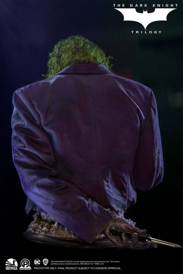 In The Dark Knight in 2008, Heath Ledger performed as an untraceable, unpredictable but charming Joker with his extraordinary acting, and this Joker is beloved by countless audience. The legends will never fade and now Infinity Studio is honored to bring this super villain to real life with our Silicone bust series! By using the latest official data, we achieved highest level of accuracy that has never been, even the material of Joker's outfit is same to original movie. LED unit is planted in the base, and make the hole looks like a Batman's signal or a bloody Joker smile. The accessories including his knife and "Joker mask" are all come with the bust, both could be set in his left hand. Every element of this bust is haunted by uncertainties and chaos, but- "Why so serious?" Size: 82 x 72 x 72 cm Limited to 500 pieces worldwide!