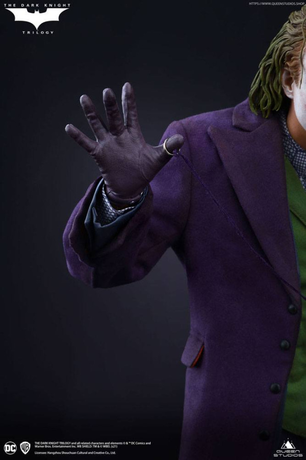 The 1/4 Scale Dark Knight Joker statue captures Heath ledger's portrayal of The Joker like you've never seen before. For this hyper-real head sculpt, Queen Studios' artists focused intensely on capturing every element. From the thick scars in his "Glasgow Grin". To the deep expression lines in his forehead. And the calm yet chaotic look in his eyes. No detail is spared.
