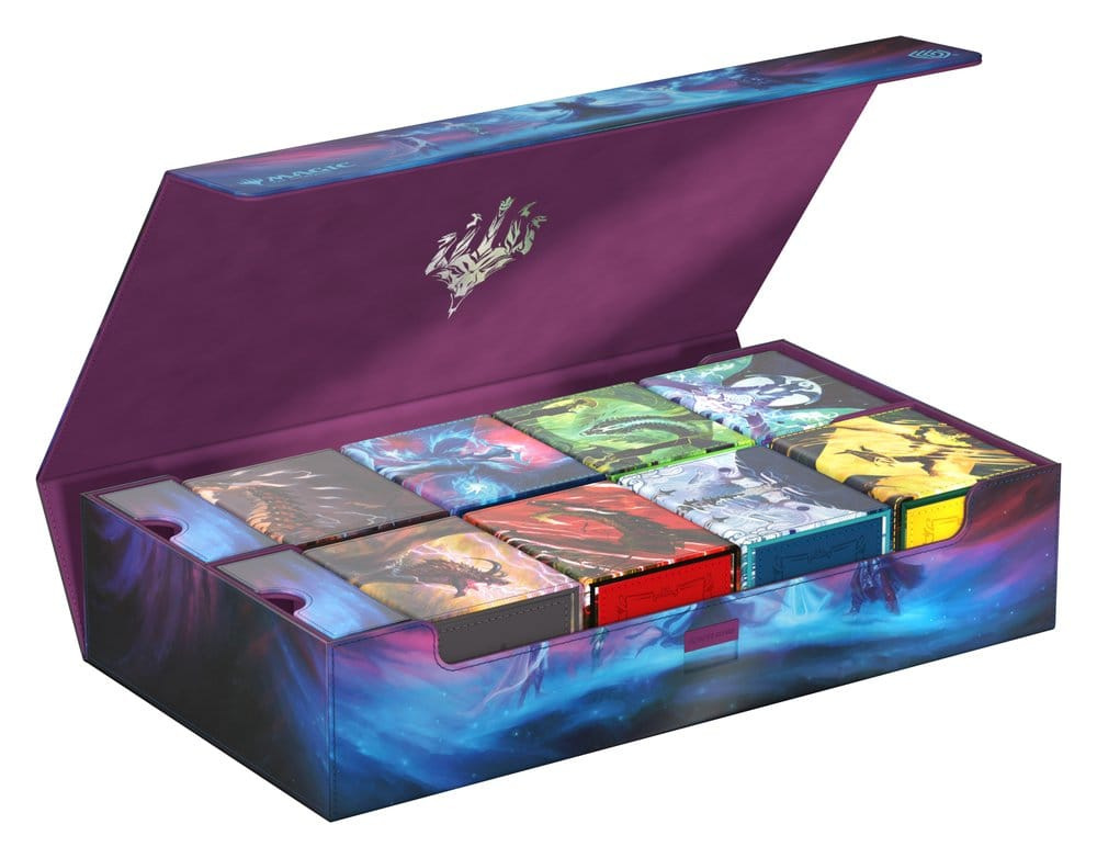 The Omnihive 1000+ Xenoskin gathers the mighty spirit dragons of Tarkir on a single deck box! Designed with two large main compartments and two flexibly positionable magnetic trays, the Omnihive can store up to 1000 single cards (double-sleeved), multiple deck boxes, accessories like dice, and/or play-mats simultaneously. The durable Xenoskin surface features the artwork Call the Spirit Dragons by Liiga Smilshkalne from Magic: The Gathering’s Tarkir: Dragonstorm set. The lid of the Omnihive is secured with strong magnets and our ZnapClaw mechanism, while the microfiber lining inside provides extra protection for cards, deck boxes, and accessories.