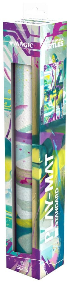 Ultimate Guard's Play-Mat Standard, featuring officially licensed artwork from the "Magic: The Gathering | Teenage Mutant Ninja Turtles" set, is a high-quality, 61 x 35 cm MTG playmat that enhances the gaming experience and protects MTG cards, sleeves, and accessories from scratches, wear, and dirt. The 2 mm thick, soft-cushioned playmat is made from natural rubber and features Ultimate Guard's trusted anti-slip underside and a high-quality, soft fabric surface. The gaming mat's stitched edges prevent fraying and ensure long-lasting durability.