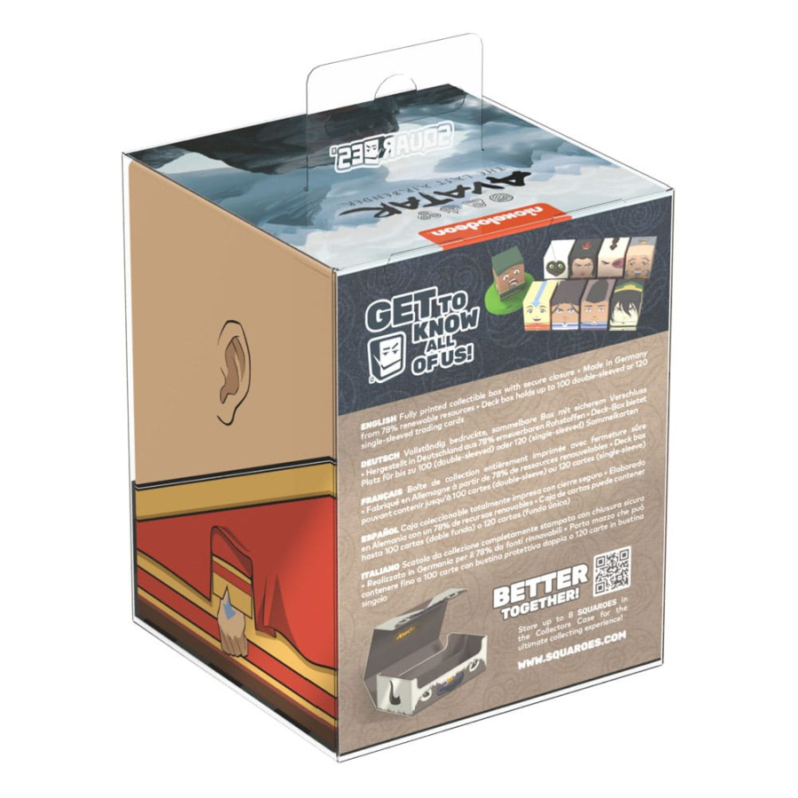Collectible box for storing TCG decks, tabletop gaming accessories, and/or collectibles. The Avatar Aang Squaroe from the Avatar: The Last Airbender edition holds up to 100 cards in double protective sleeves if used as a deck box. Squaroes are made from 78% renewable recources and fit perfectly into the separately available Collectors Case.